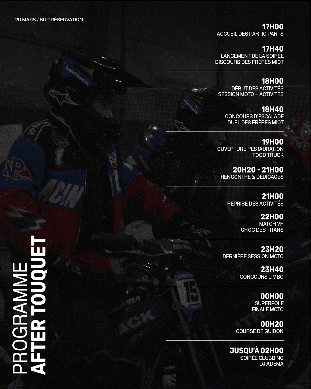 Vivez une soirée exceptionnelle lors de l’After Touquet chez UniTrack : une session moto sur la piste, des activités en libre accès, des rencontres avec les frères Miot et une ambiance festive jusqu’à 2h du matin. Entre adrénaline, défis et animations, préparez-vous à partager un moment unique entre passionnés dans une atmosphère survoltée.